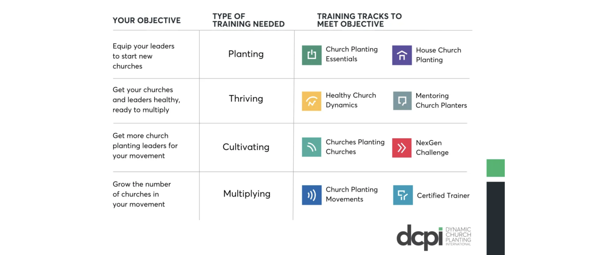 Whether you are already planning to plant a church, or need to assess and refresh your existing church, DCPI offers a variety of biblical, practical trainings born out of decades of in-the-trenches Kingdom experience. As Master Trainers with DCPI, we can help you identify where you are and put together a plan to equip you for the next steps in your journey.